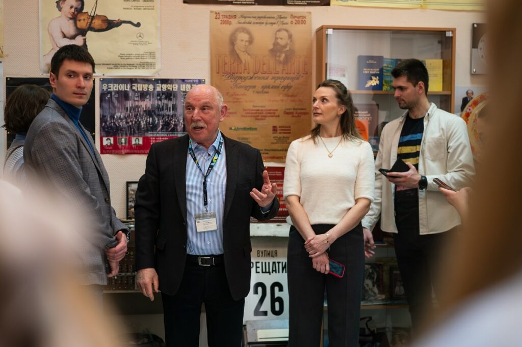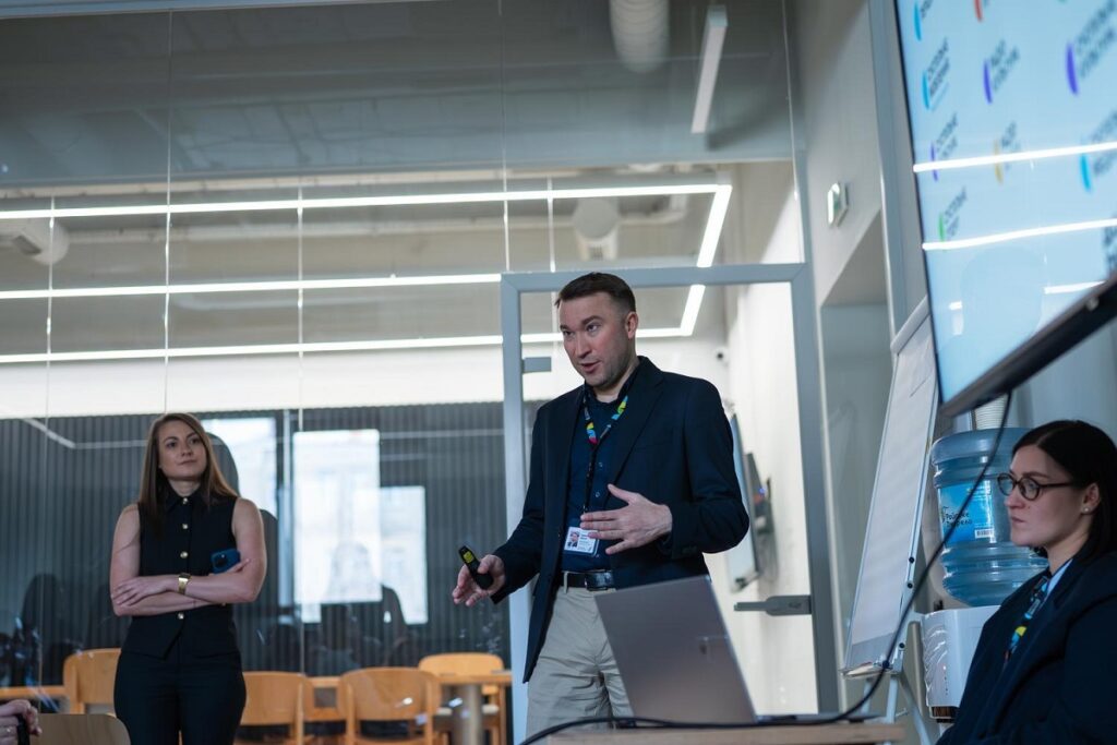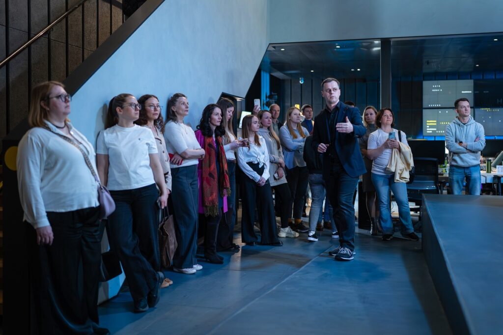 Член правління Суспільного Дмитро Козлов звернув увагу гостей на виклики трансформації великої організації, зокрема те, що в компанії переплітаються різні виробничі культури. Водночас, за його словами, обмежені ресурси спонукають компанію працювати максимально ефективно та не допускати нераціонального використання коштів: